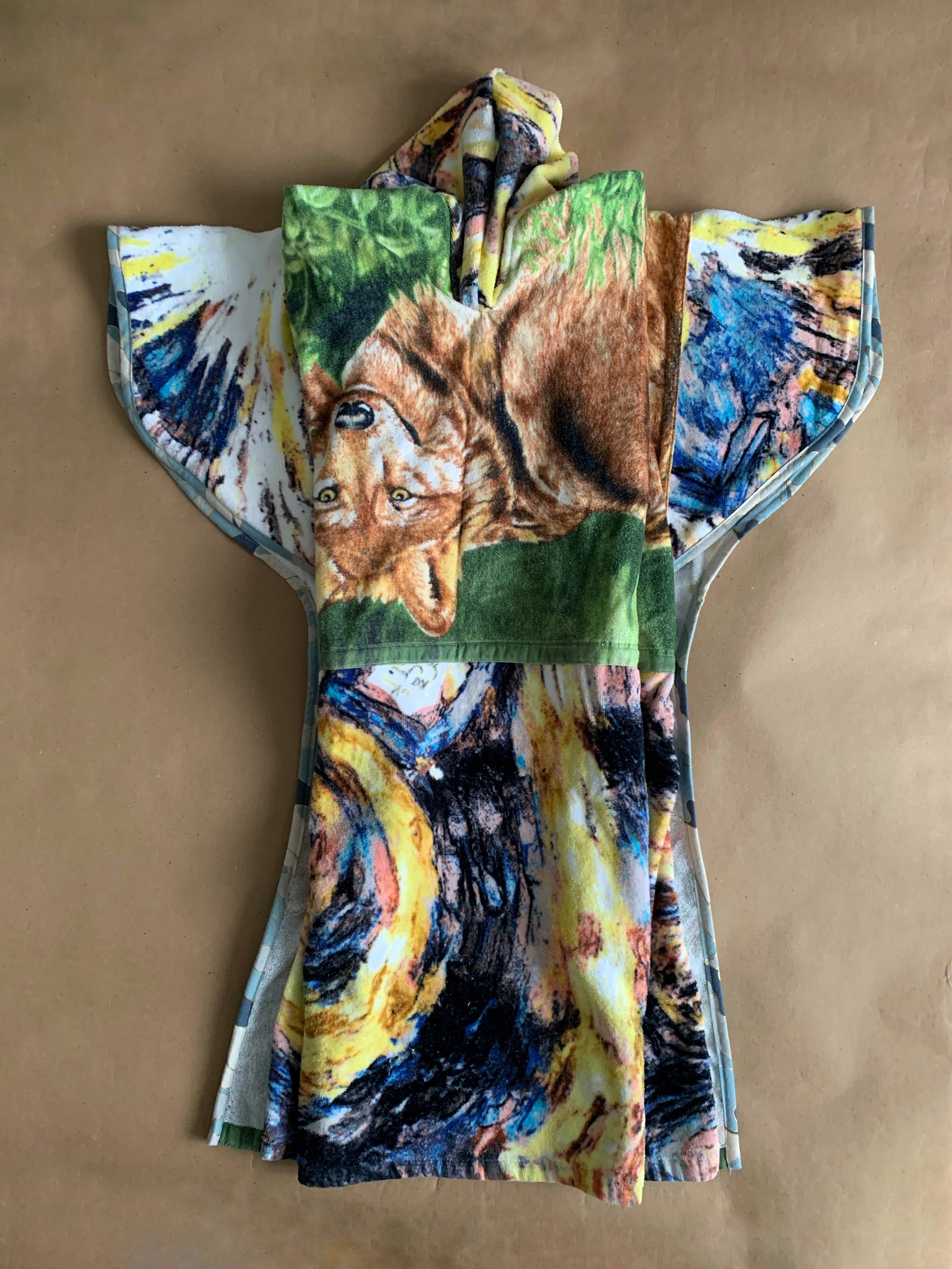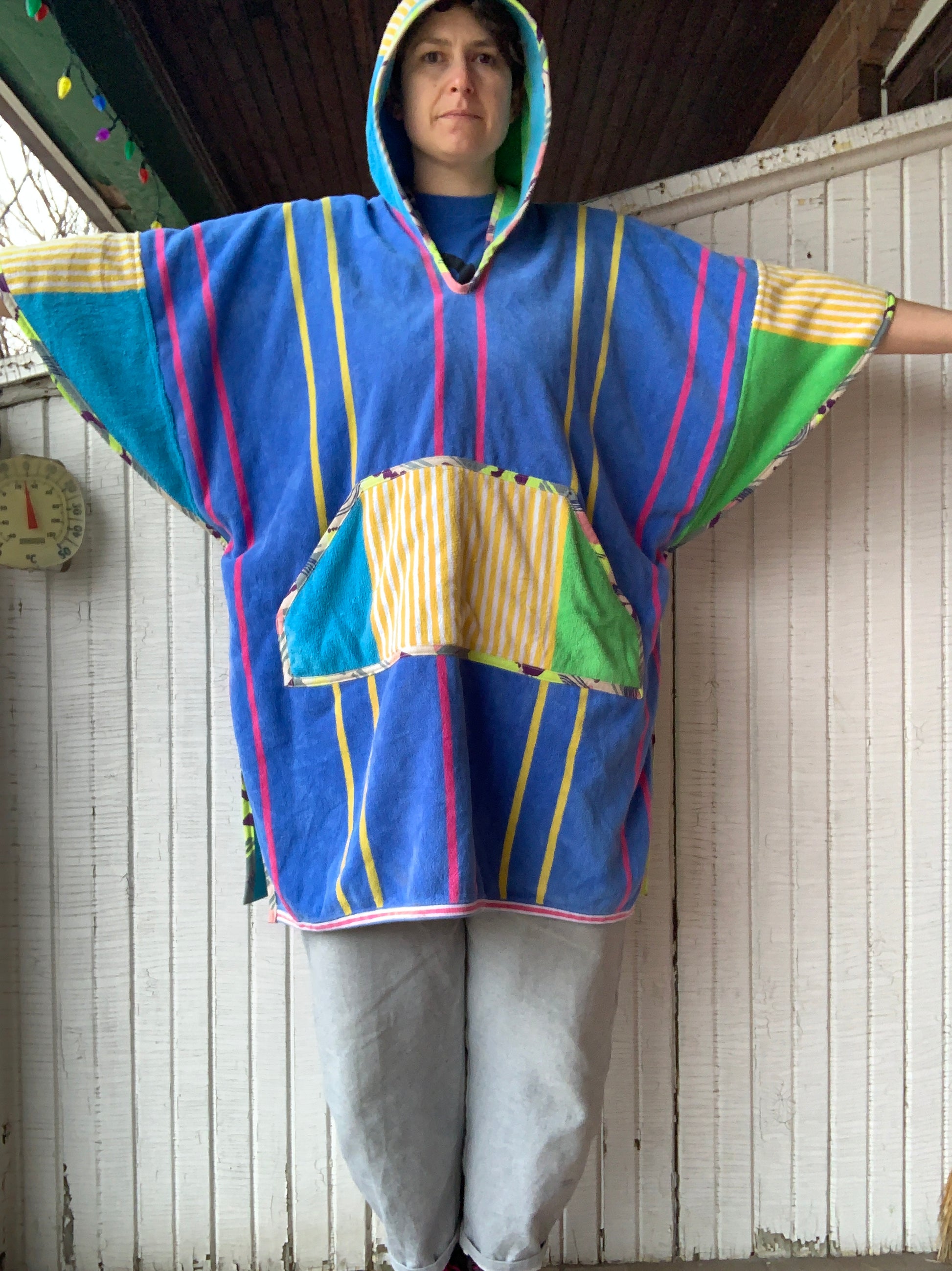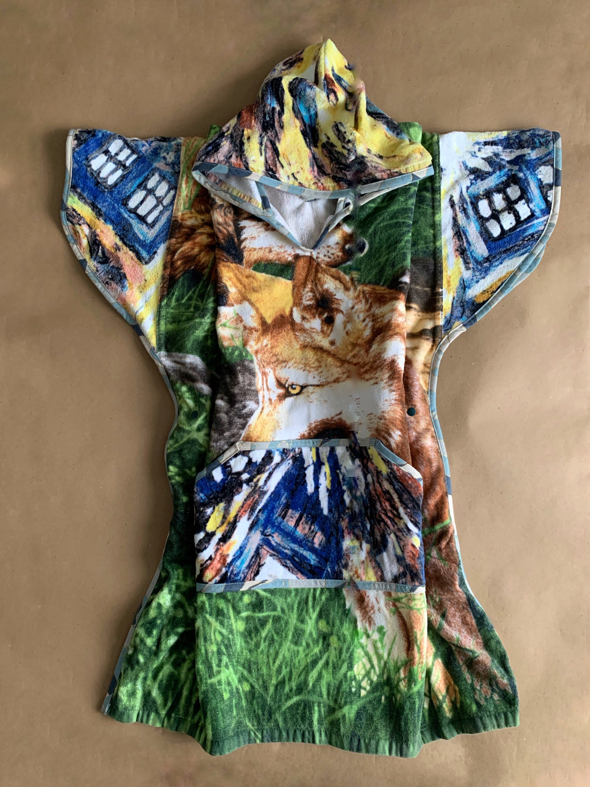 Upcycled hooded towel ponchos with kangaroo pocket and side snaps for the adults have arrived. These totally unique one of a kind summer staples are made in collaboration with Amanda from TOKKI and are perfect for the beach, the cottage, or the indoor pool.
