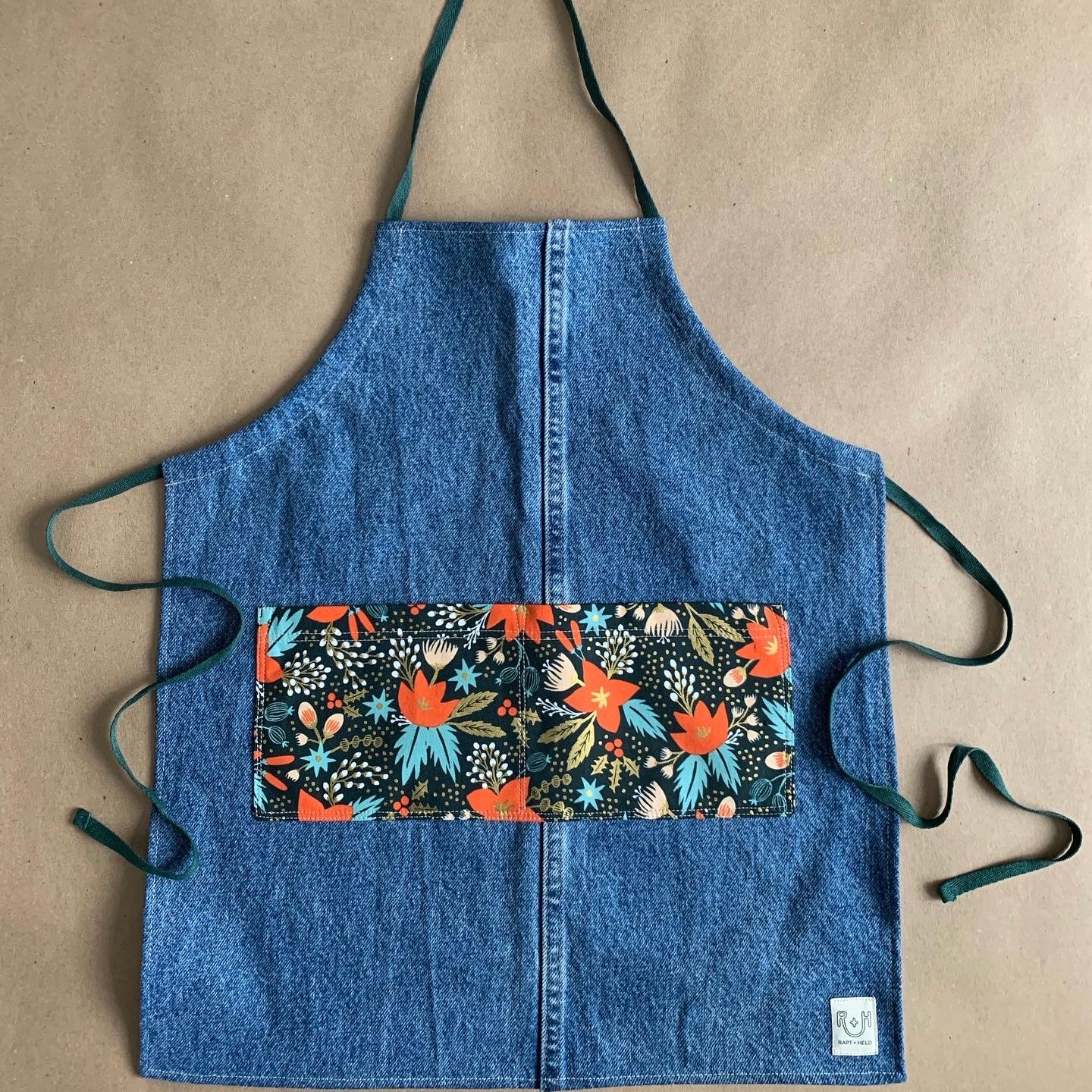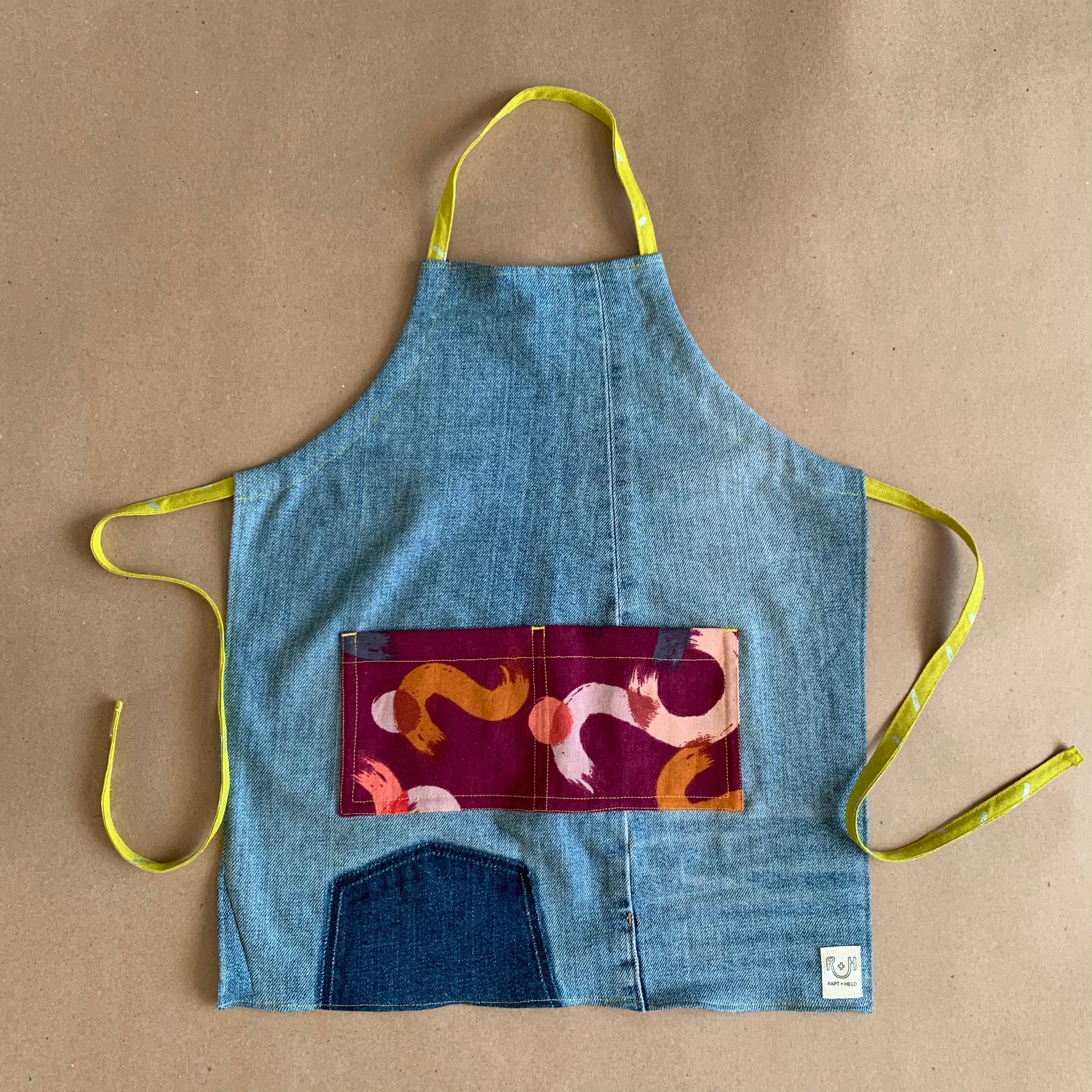 Whether cooking or crafting, these fun aprons with contrast pocket are fantastic for kids (and adults) of all ages! Made with upcycled and dead stock denim, duck cloth, and mattress ticking, these washable aprons are fully adjustable and made to fit everyone, and will grow with your tiny chef for years!
