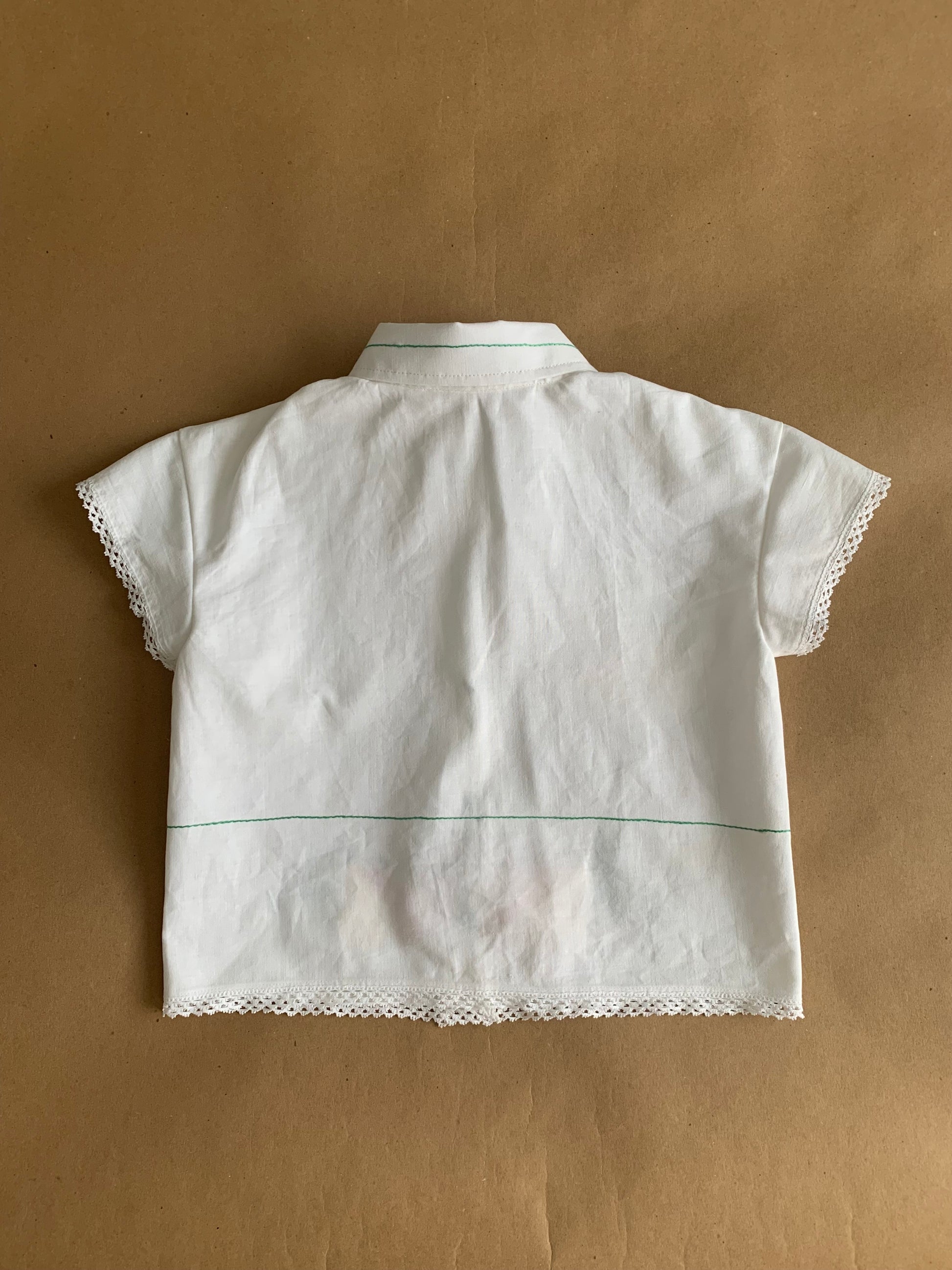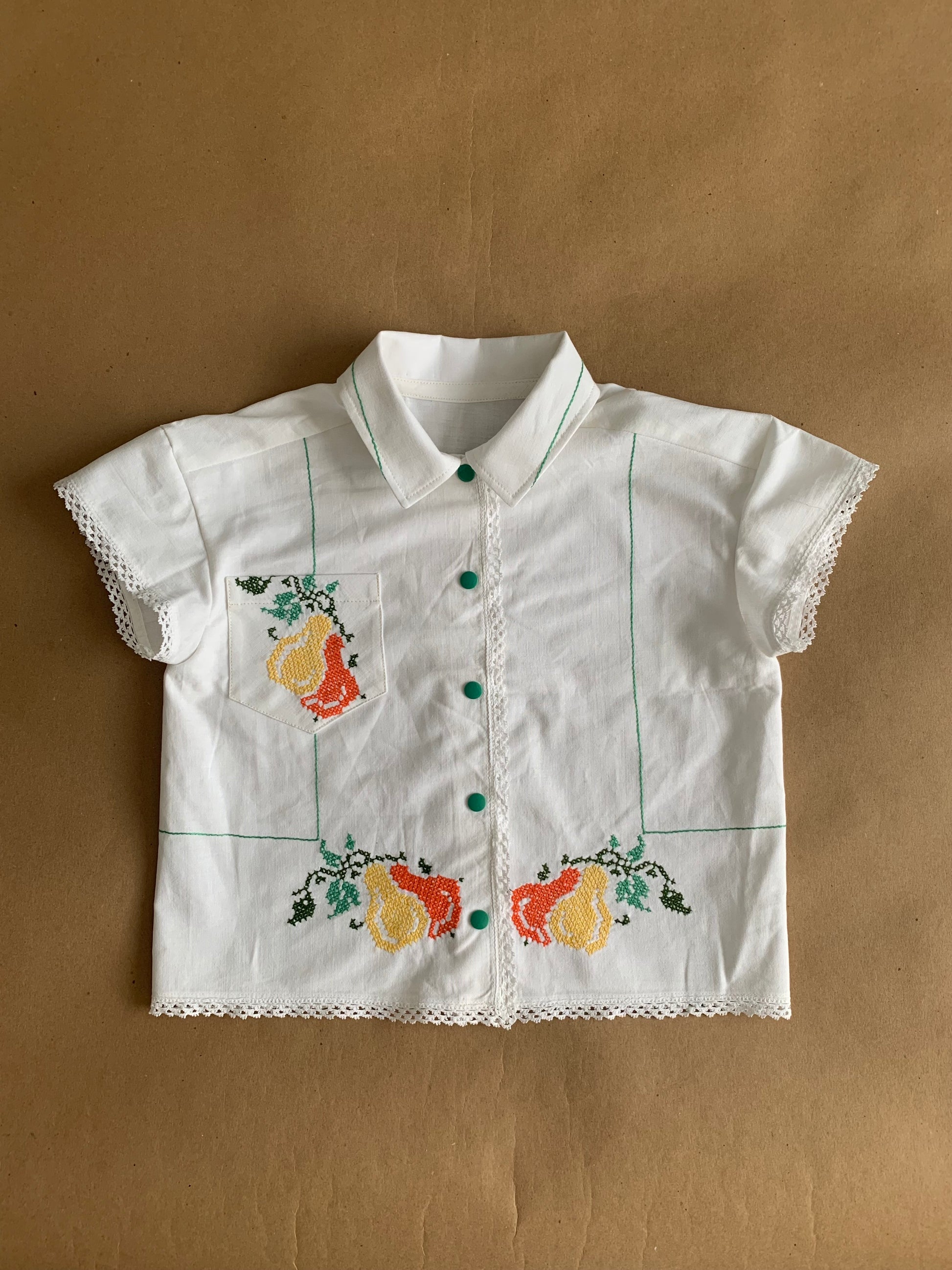 This boxy button down is perfect for the summer, and easy to pair with jeans, a skirt, or leggings, you do you. Made from a thrifted tablecloth this shirt has tone of details and a breezy fit for maximum comfort and is a great option for everyday.