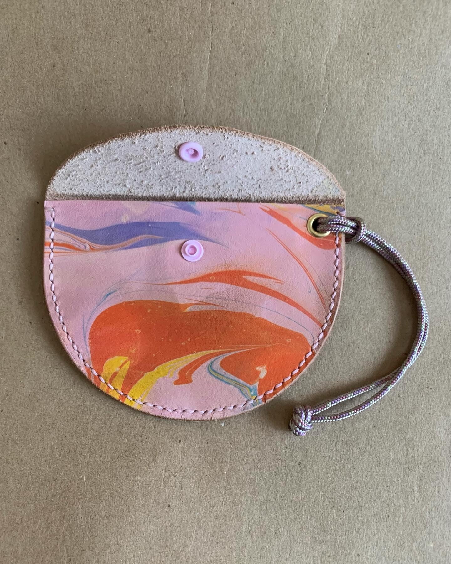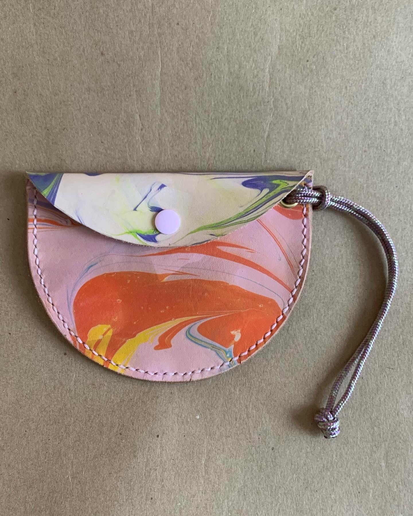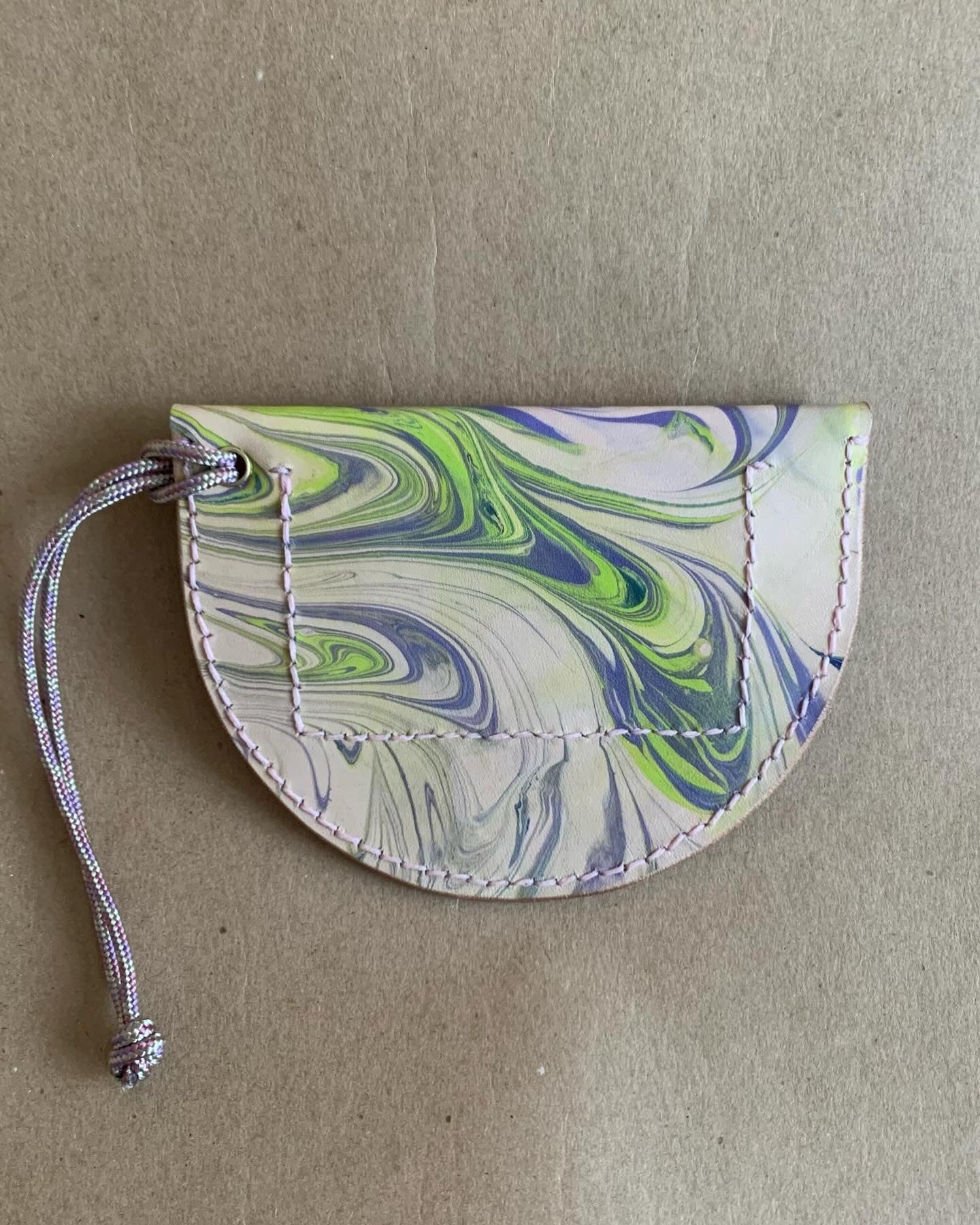 Mini purses. Perfect for a credit card, some cash and maybe a key or two, these pouches can be worn on your wrist, or attached to the inside of a larger bag or your key ring etc, the possibilities are endless. Leather marbled by me, and hand stitched and finished by me too (no surprise there) these sweet bags are a love note to the labour of love that is making, trying to eek out the most from this gorgeous marbled veg tan leather. Shout out to Mokuba as well for the perfect cording. Each bag is approximately 5” wide at the opening and 3” deep at the center.