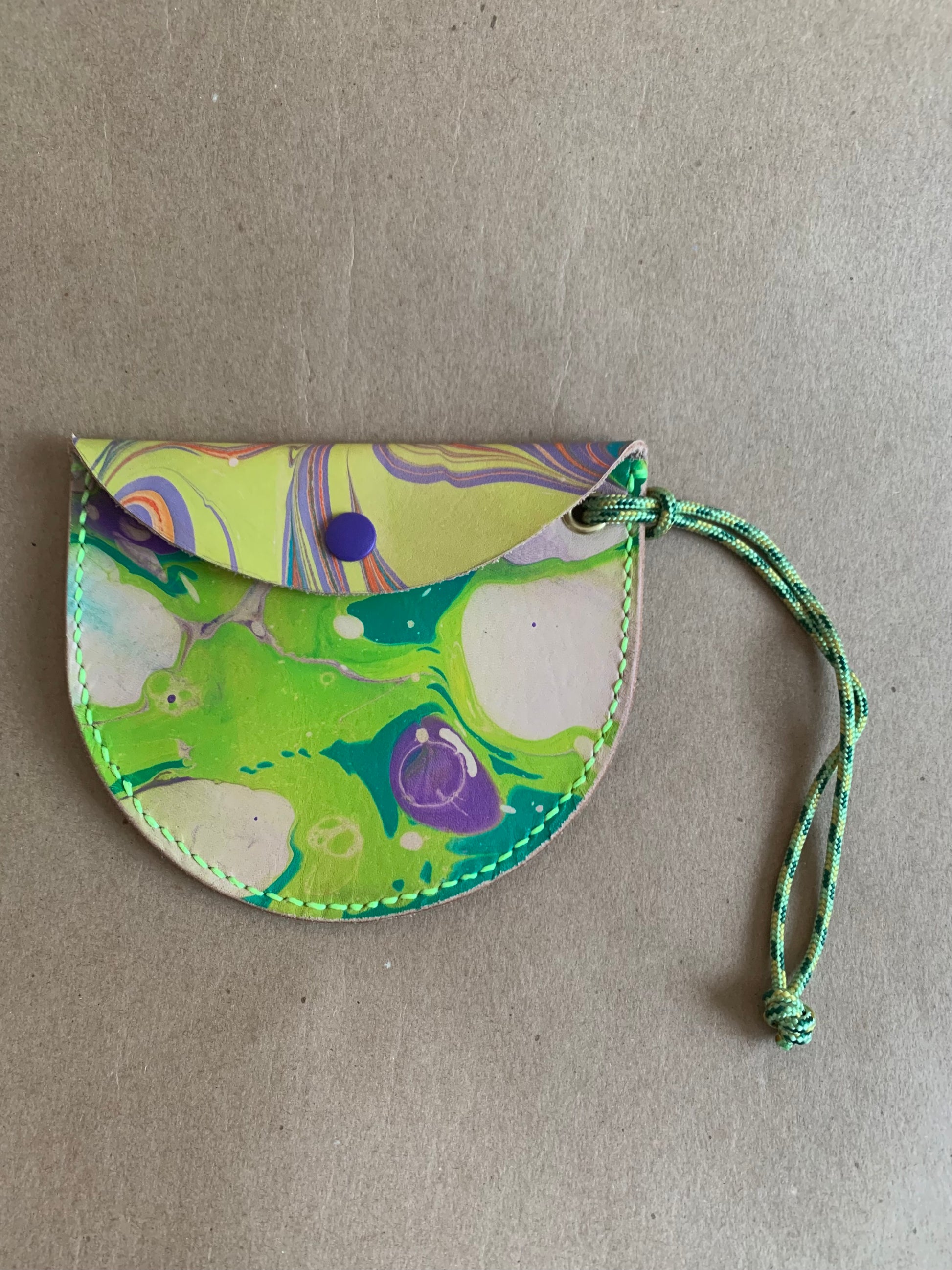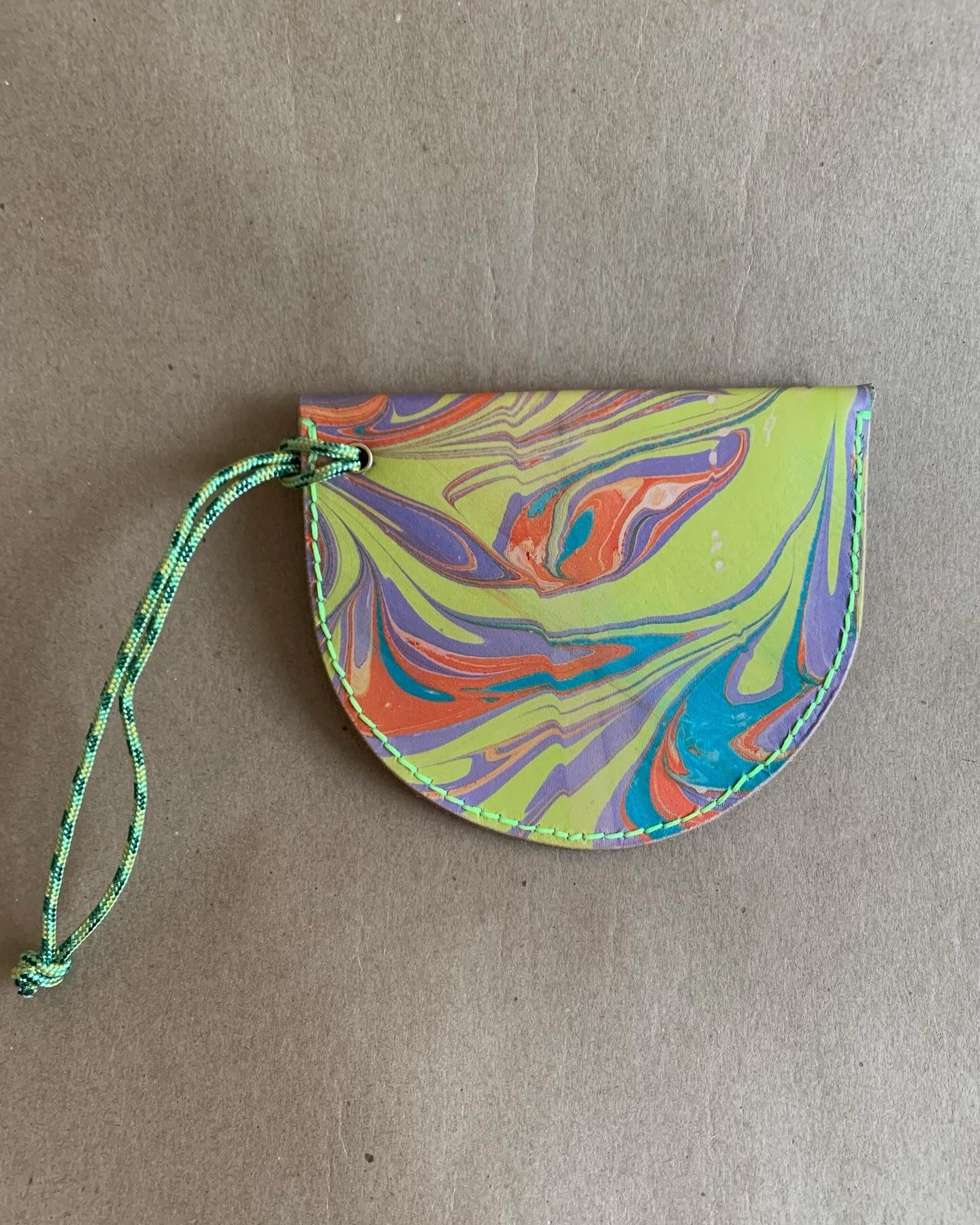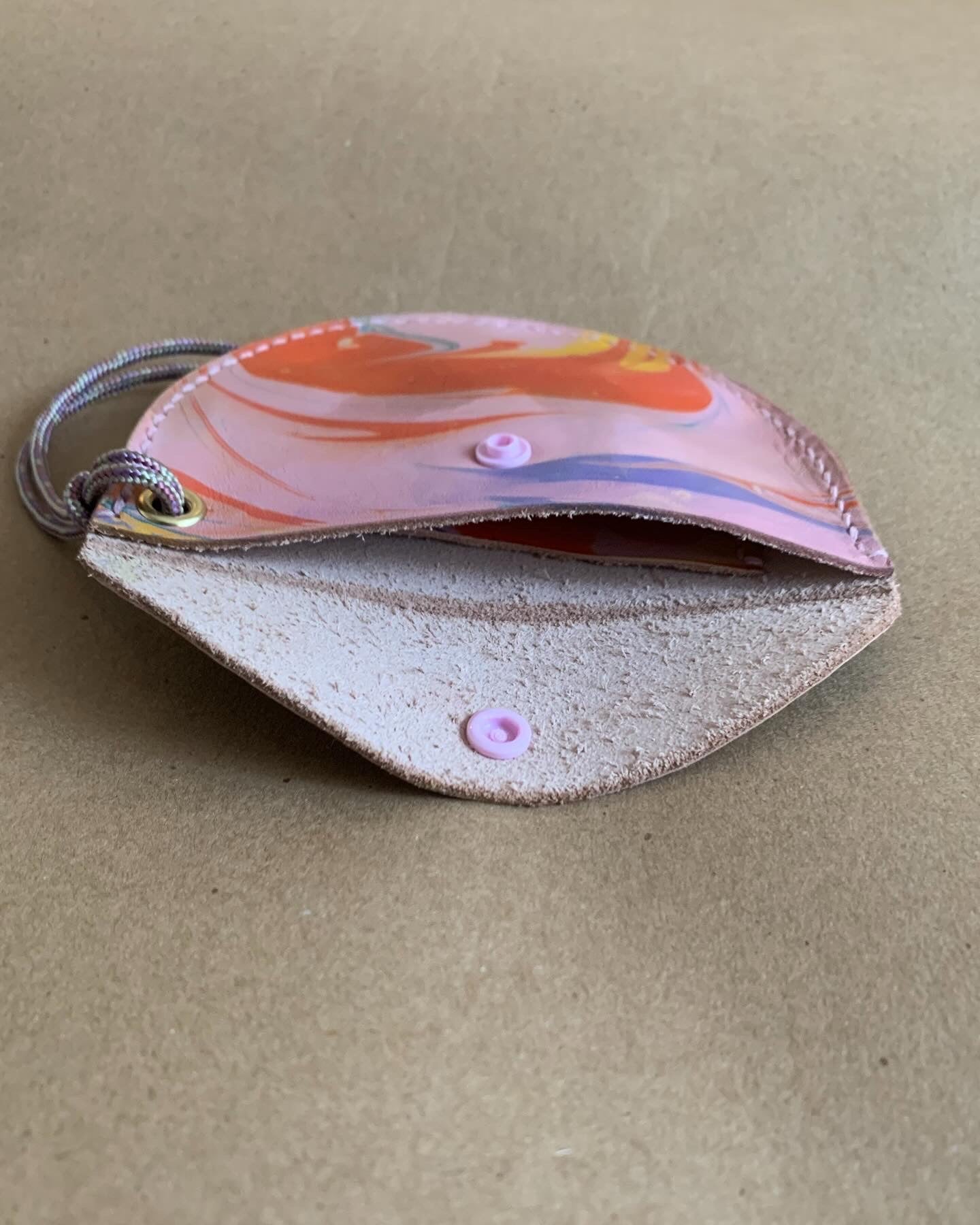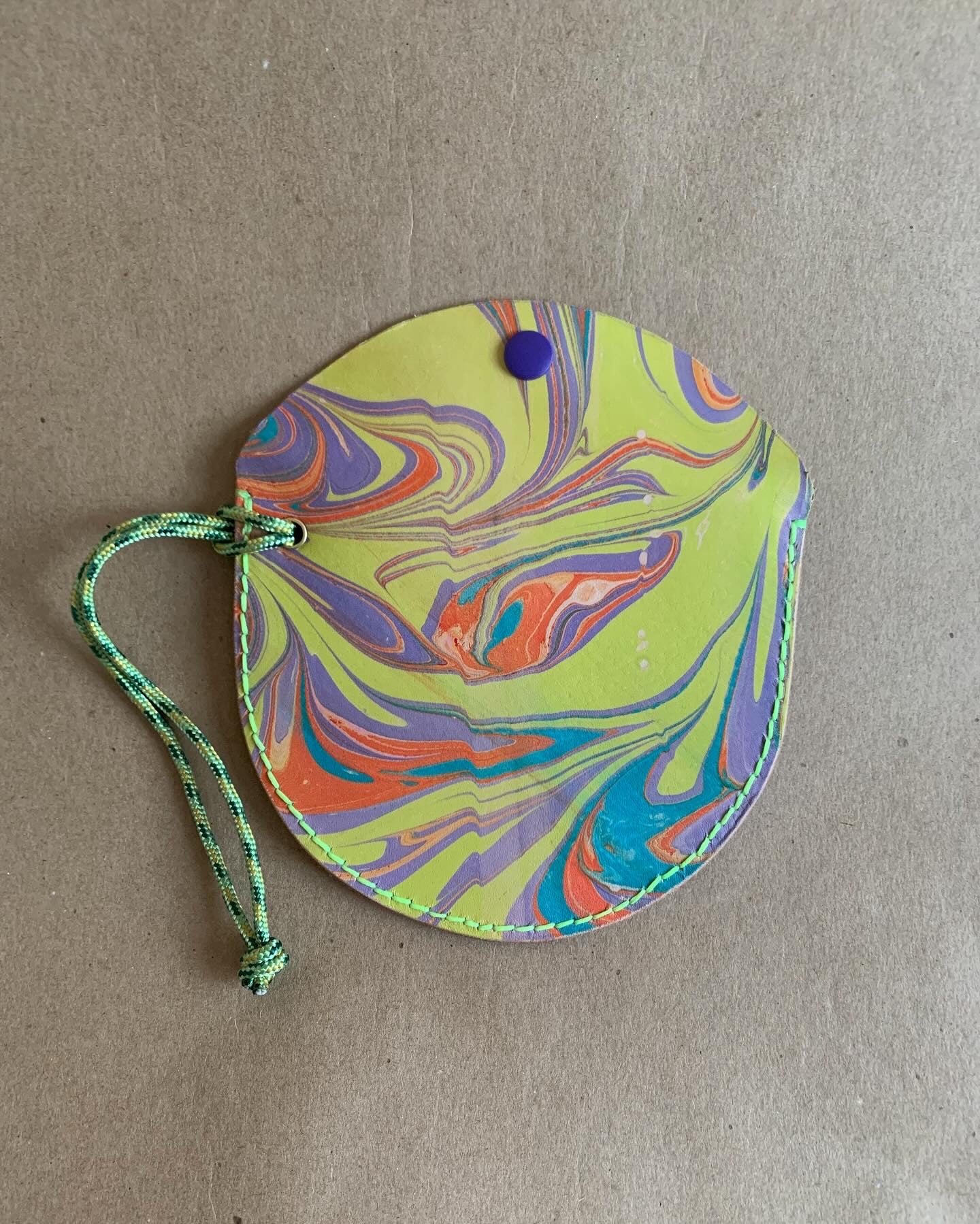 Mini purses. Perfect for a credit card, some cash and maybe a key or two, these pouches can be worn on your wrist, or attached to the inside of a larger bag or your key ring etc, the possibilities are endless. Leather marbled by me, and hand stitched and finished by me too (no surprise there) these sweet bags are a love note to the labour of love that is making, trying to eek out the most from this gorgeous marbled veg tan leather. Shout out to Mokuba as well for the perfect cording. Each bag is approximately 5” wide at the opening and 3” deep at the center.