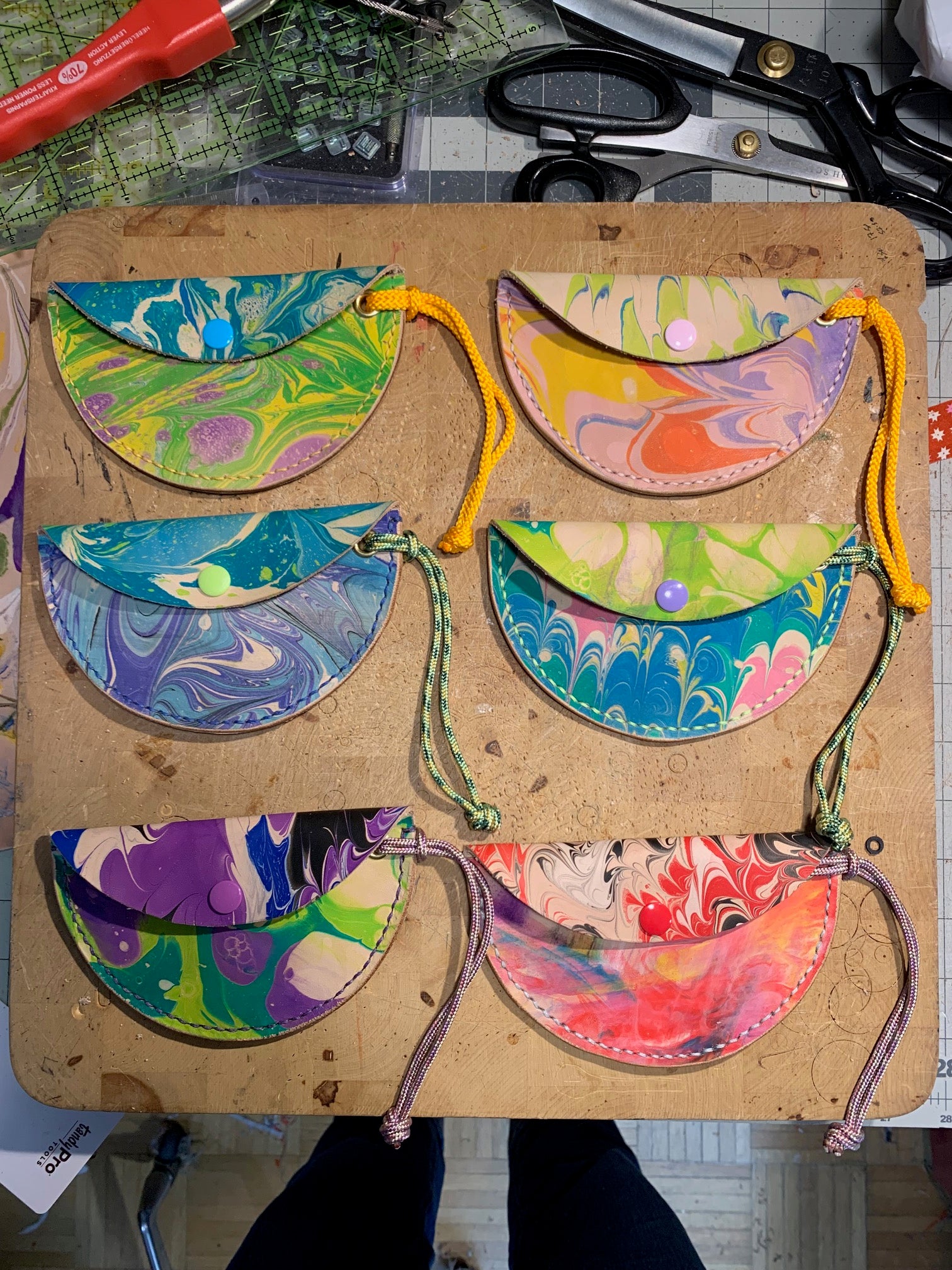 Mini purses. Perfect for a credit card, some cash and maybe a key or two, these pouches can be worn on your wrist, or attached to the inside of a larger bag or your key ring etc, the possibilities are endless. Leather marbled by me, and hand stitched and finished by me too (no surprise there) these sweet bags are a love note to the labour of love that is making, trying to eek out the most from this gorgeous marbled veg tan leather. Shout out to Mokuba as well for the perfect cording. Each bag is approximately 5” wide at the opening and 3” deep at the center.
