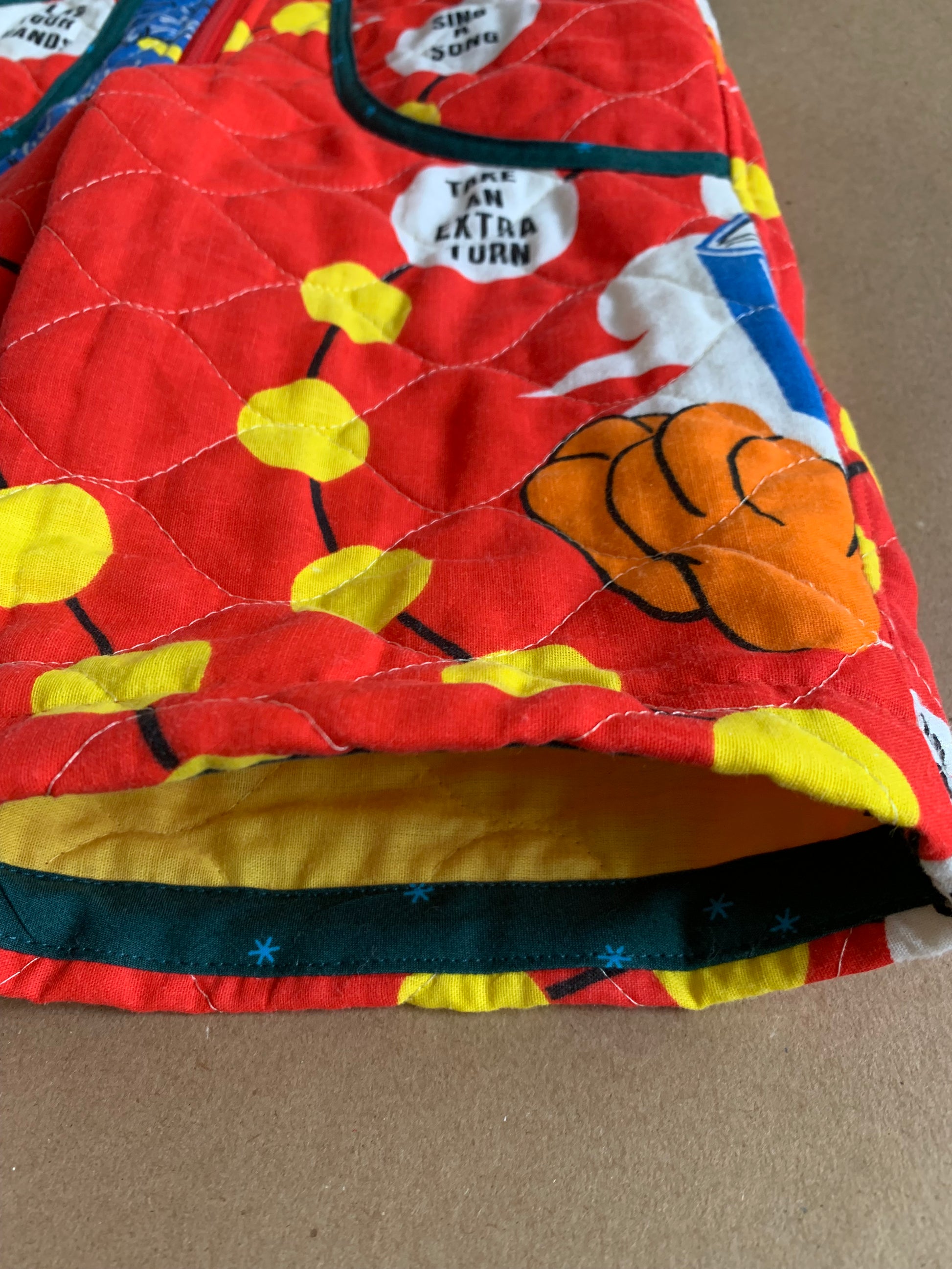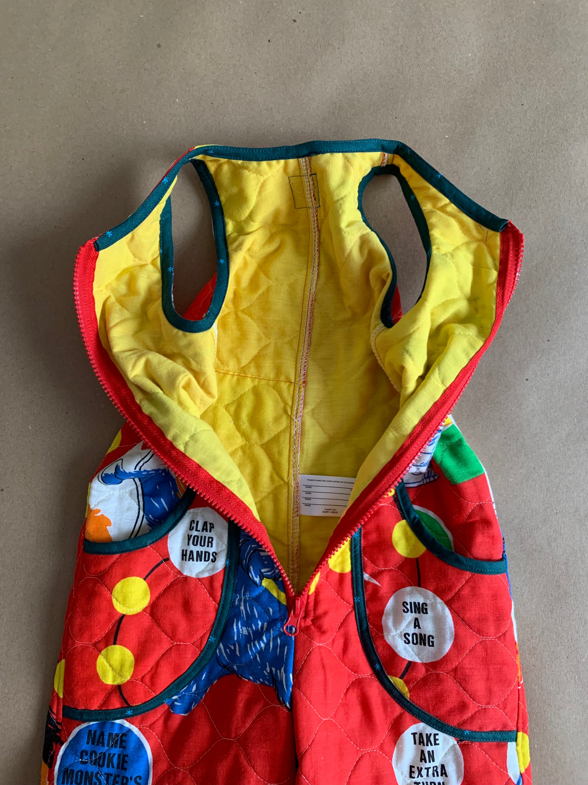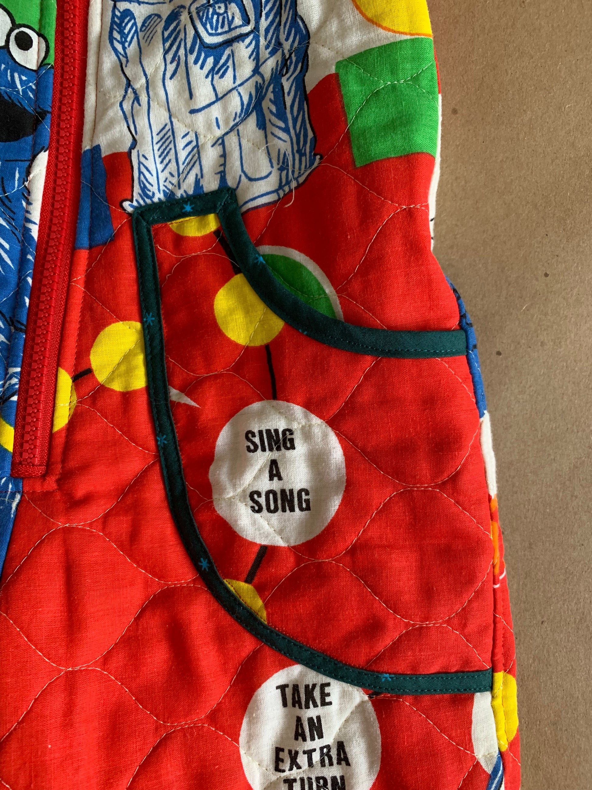 Call it what you want, romper, jumpsuit, playsuit - I call it pajamas you can leave the house in! With front and back pockets and front zipper closure, this romper is great for kids who are potty trained because they can easily get themselves in and out of it. Made from the last of a thrifted Sesame Street quilted board game panel, this romper is an instant classic and future heirloom in the making.