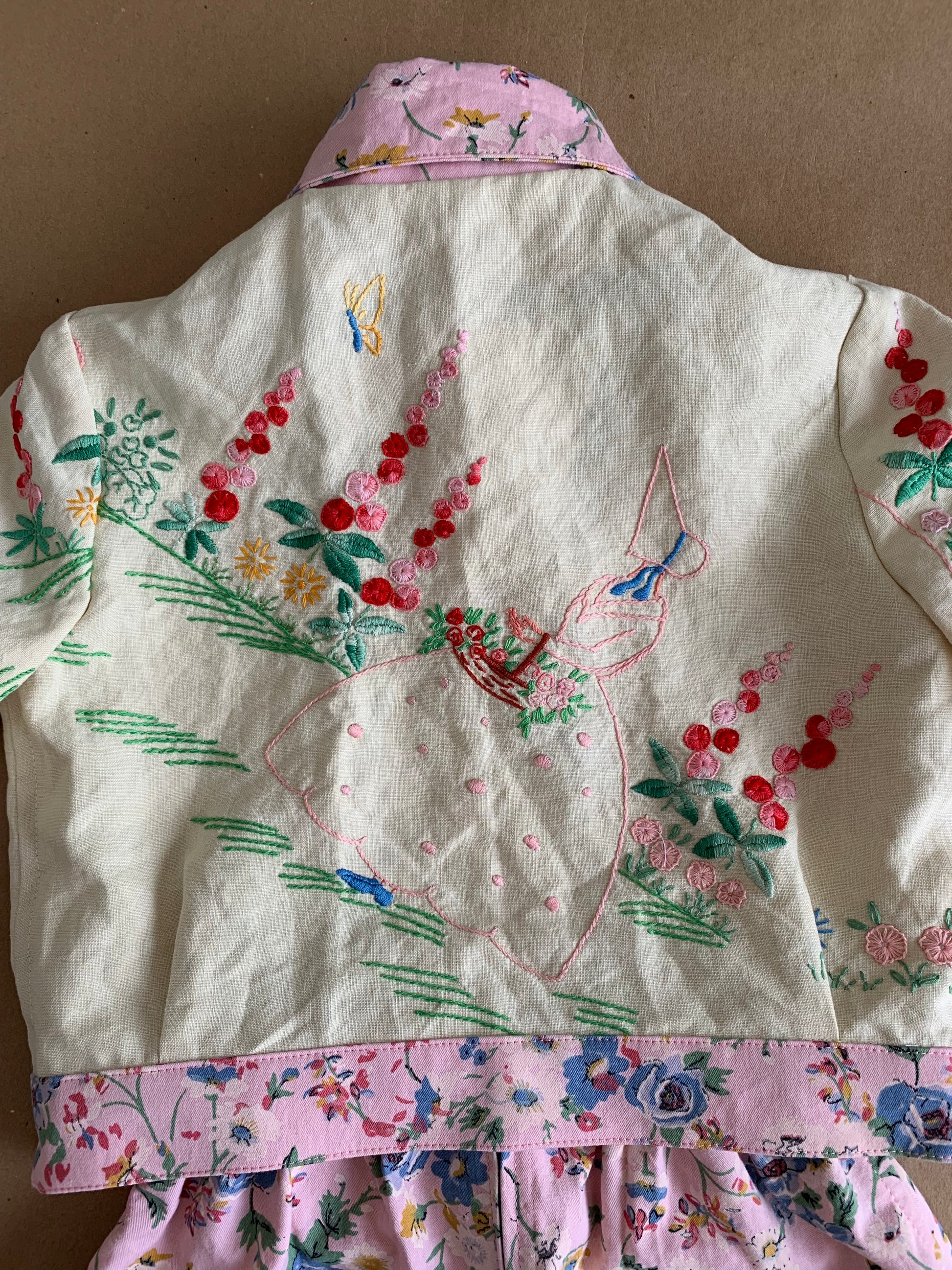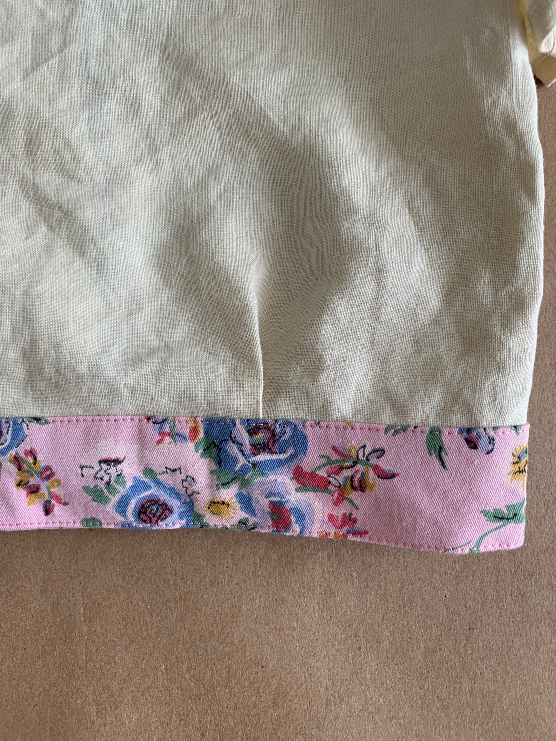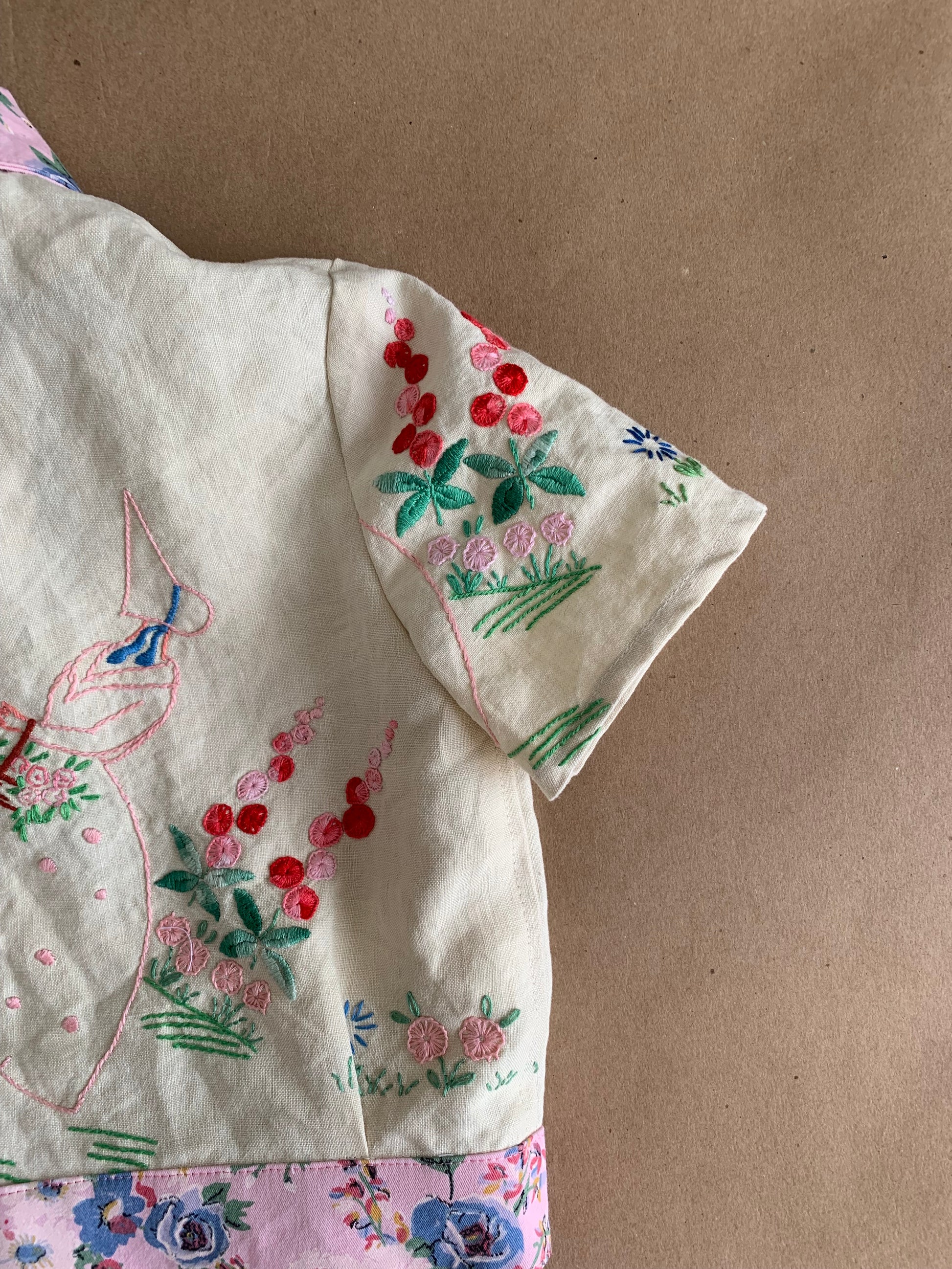 This charming two piece set would be the absolute perfect back to school look for the discerning 8 yr old! Made from a selection of thrifted linens and prints from my dear friend Sarah of Brim Shoppe, and based on a 1970s vintage pattern, this structured top and coordinated shirt is an absolute dream! The shirt can be worn on its own, or open over a tank top, simple dress or turtleneck and the shirt is slightly a-line with an elasticated waistband and zipper closure at the back. Who wouldn't want to rock up to the first day of school in this?!